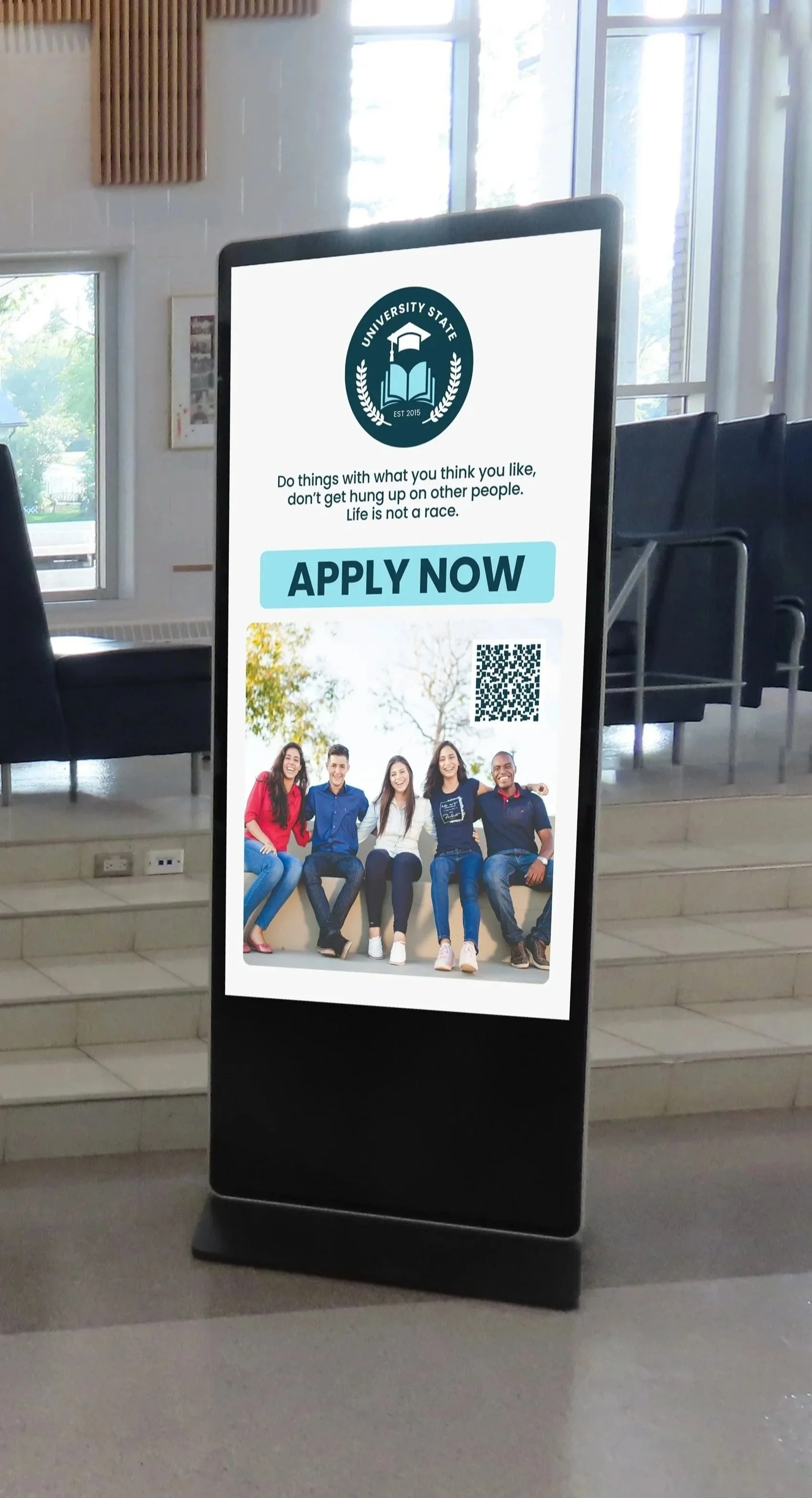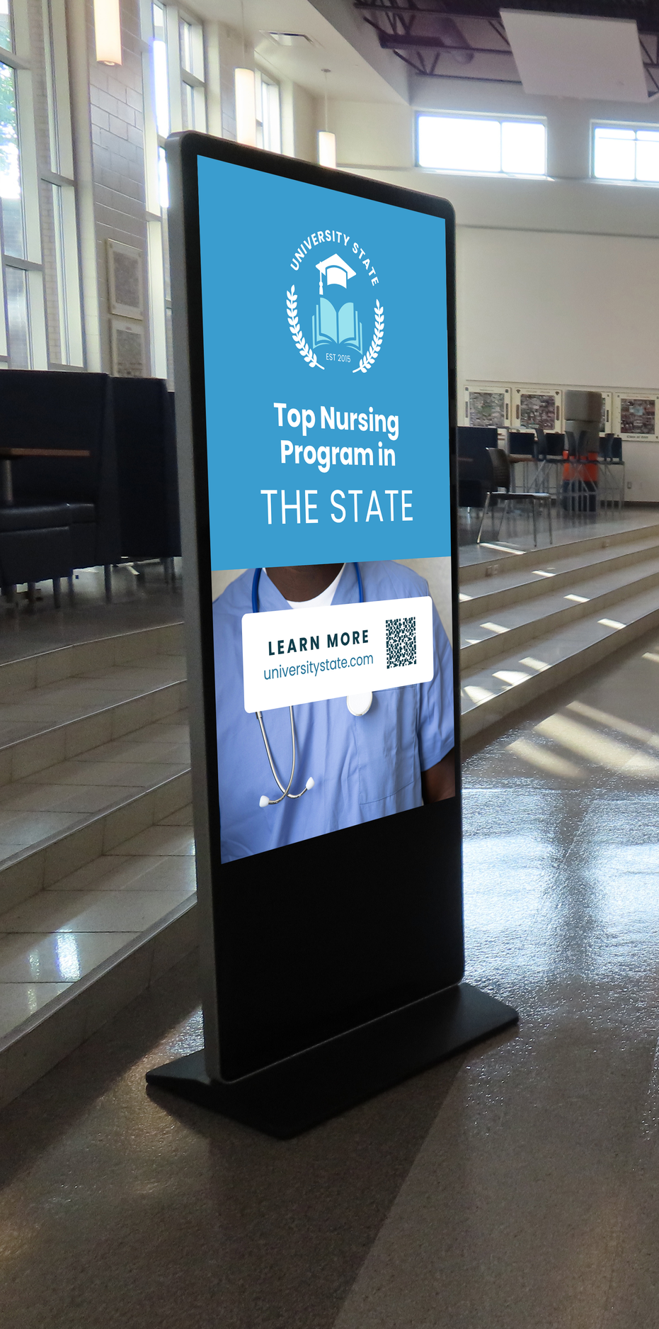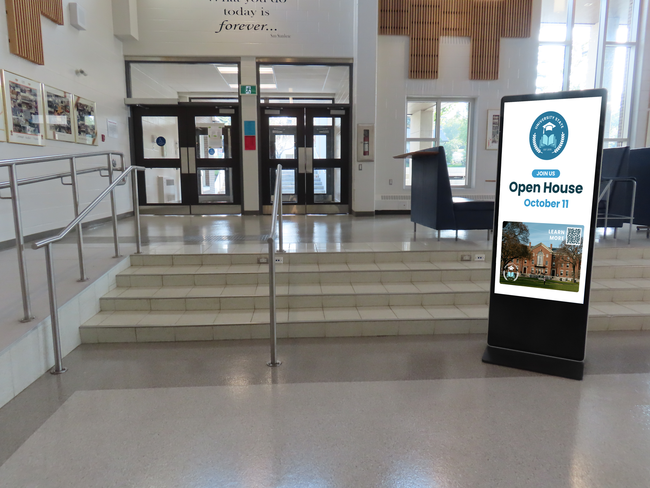 Your institution on high-traffic digital screens inside high schools, in hallways, common areas, and the spaces where students actually are. Non-skippable. Consistent. All year.