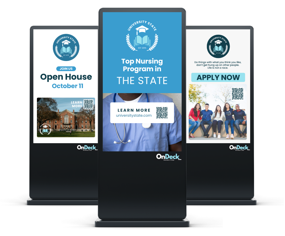 OnDeck installs a free digital screen in your school that keeps colleges, universities, and post-secondary options visible to students every day — no setup, no maintenance, no cost. We handle everything. Your students just start seeing what's possible.